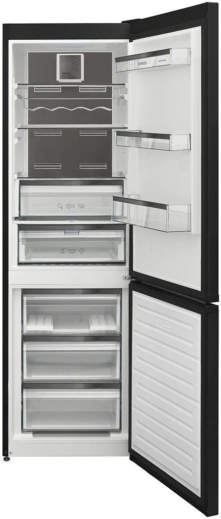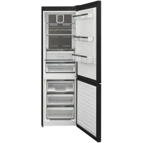 Atutem lodówki jest dyskretna praca. Dźwięk, który generuje, można porównać do cichej rozmowy, co sprawia, że urządzenie nie będzie Ci przeszkadzać w codziennej pracy. W komorze chłodzenia zastosowano system No Frost, który zapewnia prawidłowy obieg powietrza i utrzymuje niski poziom wilgoci. Ta technologia sprawia, że na ściankach chłodziarki nie gromadzi się szron ani lód, co całkowicie eliminuje konieczność ręcznego rozmrażania. W urządzeniu znajduje się sterowanie elektroniczne. Taki moduł sterowania jest komfortowy w obsłudze i pozwala na precyzyjne ustawienie temperatury w komorze chłodzenia lub w zamrażalniku. Producent wyposażył lodówkę w oświetlenie LED, które charakteryzuje się dużą energooszczędnością i bardzo długą żywotnością. To przekłada się na niższe koszty eksploatacyjne urządzenia. LED-y doskonale oświetlają żywność we wnętrzu, dzięki czemu będziesz mógł sięgnąć po jedzenie, nie włączając górnego źródła światła w pomieszczeniu kuchennym.