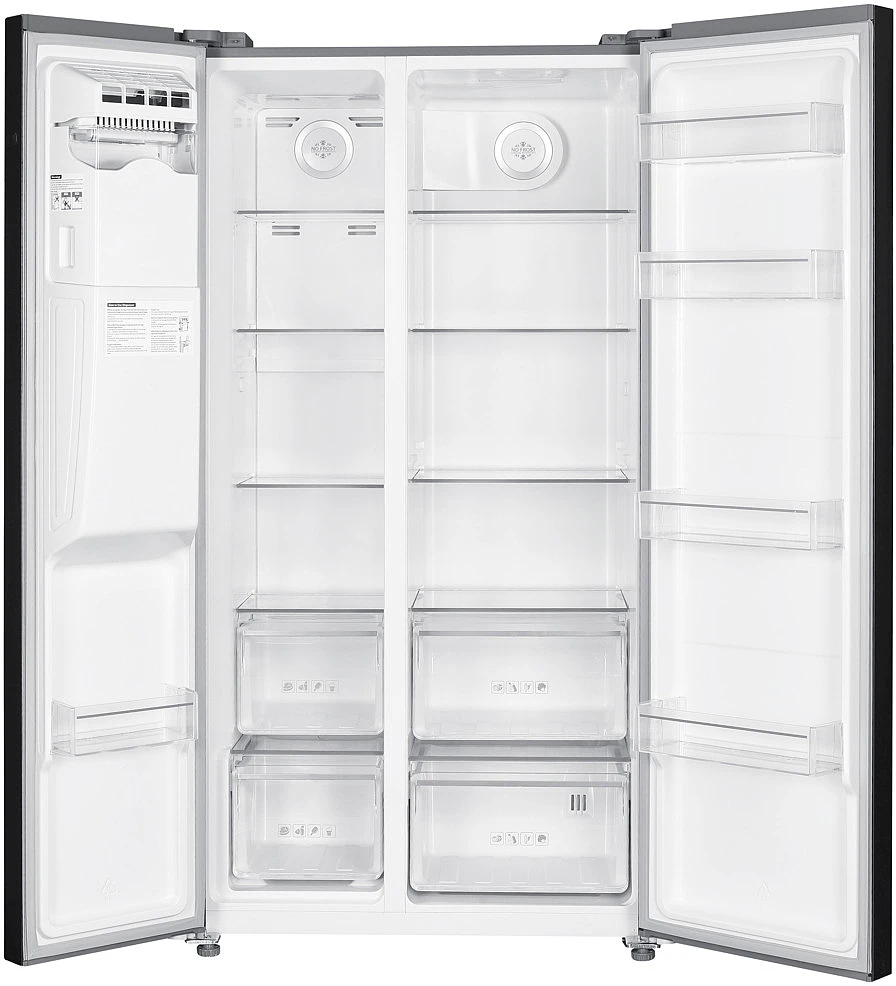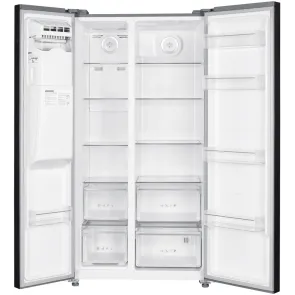 Atutem tego modelu jest bardzo cicha praca. Odgłos, który generuje, jest podobny do szumu w domu, dzięki czemu lodówka nie będzie Ci przeszkadzać w codziennej pracy. W komorze chłodzenia zastosowano system No Frost, który zapewnia prawidłowy obieg powietrza i utrzymuje niską wilgoć. Ta technologia sprawia, że wewnątrz części chłodzącej nie osadza się szron ani lód, co całkowicie eliminuje konieczność ręcznego rozmrażania. Istotnym elementem lodówki jest dyspenser wody, który gwarantuje dostęp do krystalicznej, zimnej wody pitnej. Dzięki niemu porzucisz kupowanie ciężkich zgrzewek z wodą, a tym samym zaoszczędzisz gotówkę i bardziej zadbasz o otaczający nas świat. Aby możliwe było korzystanie z wody, urządzenie należy przypiąć do instalacji wodnej. Dzięki temu dyspenser będzie stale uzupełniany chłodną wodą. Jednym z ciekawszych rozwiązań w lodówce jest wbudowana kostkarka, która zapewnia stały dostęp do lodu. Mając kostkarkę, z łatwością przygotujesz zimne koktajle czy mrożoną kawę podczas upałów.