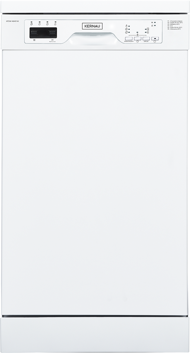 Zmywarka wolnostojąca marki Kernau o klasie energetycznej E i szerokości 45 cm zmieści 10 kompletów naczyń.